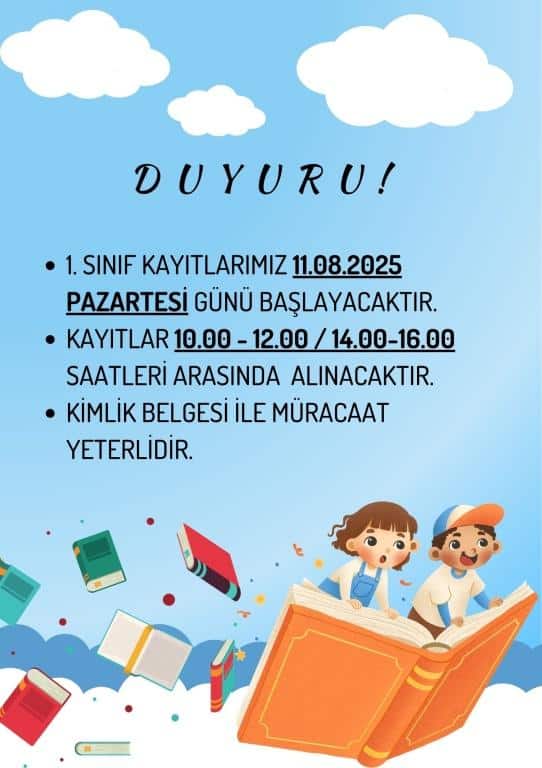 2025-2026 EĞİTİM ÖĞRETİM YILI 1. SINIF KAYITLARIMIZ 11.08.2025 PAZARTESİ GÜNÜ BAŞYALACAKTIR.